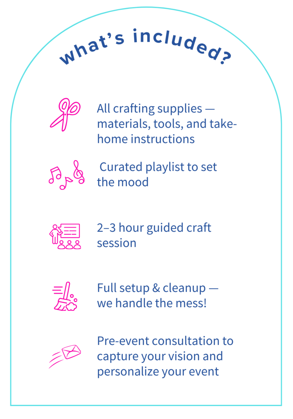 Get ready for a creative, stress-free good time with your favorite people! We’ll handle the setup, supplies, and cleanup, so you can kick back, craft, chat, and create together to your heart’s content.